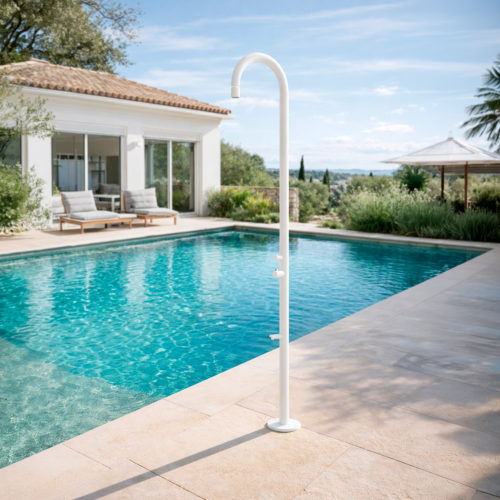 Ducha exterior blanca en acero inox 316L con mezclador y lavapies