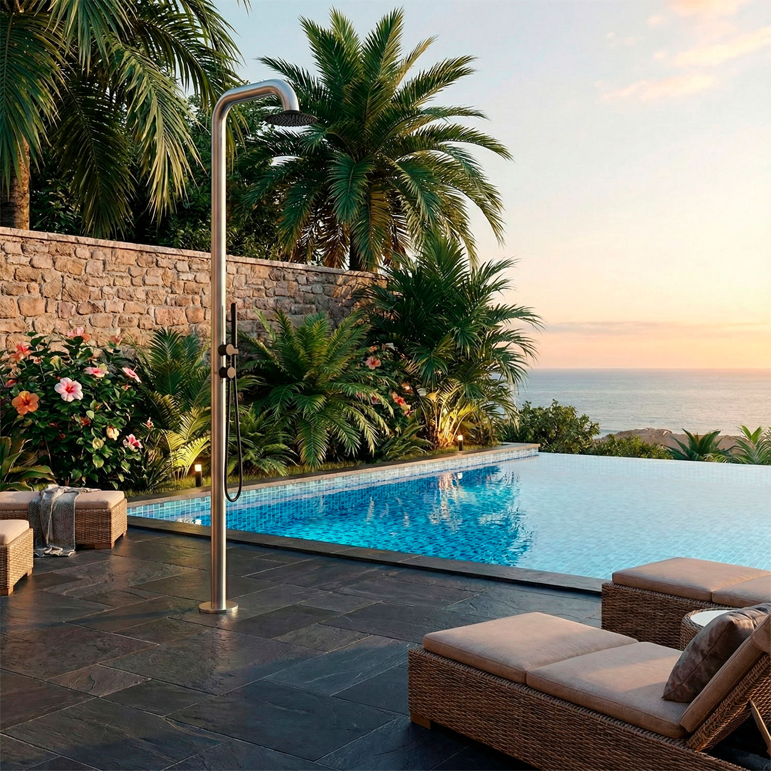 1-DUCHA EXTERIOR JARDÍN PREMIUM: La ducha de jardín de alta calidad modelo PULA de Acero Inoxidable está diseñada para cualquier instalación exterior, ya sea comercial o privada, en piscinas, jardines o spas.